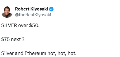 根据清崎在社交媒体平台X的一篇文章,这位金融教育家强调,强劲的势头可能使白银价格从目前的50美元/盎司左右飙升至75美元/盎司。