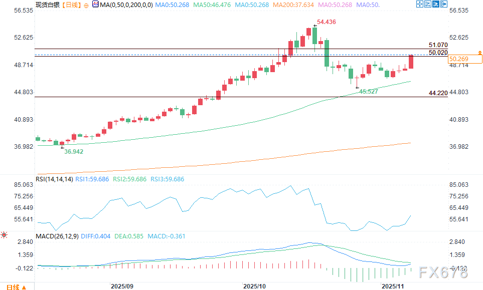 据芝商所美联储观察工具显示,交易员目前预计美联储12月10日会议降息概率为65%。这一预期推动美元指数跌至99.643,吸引新的买盘流入贵金属市场。黄金的避险涨势为白银提供了额外支撑,但多头仍需突破51.07美元才能确认下一波上涨行情。