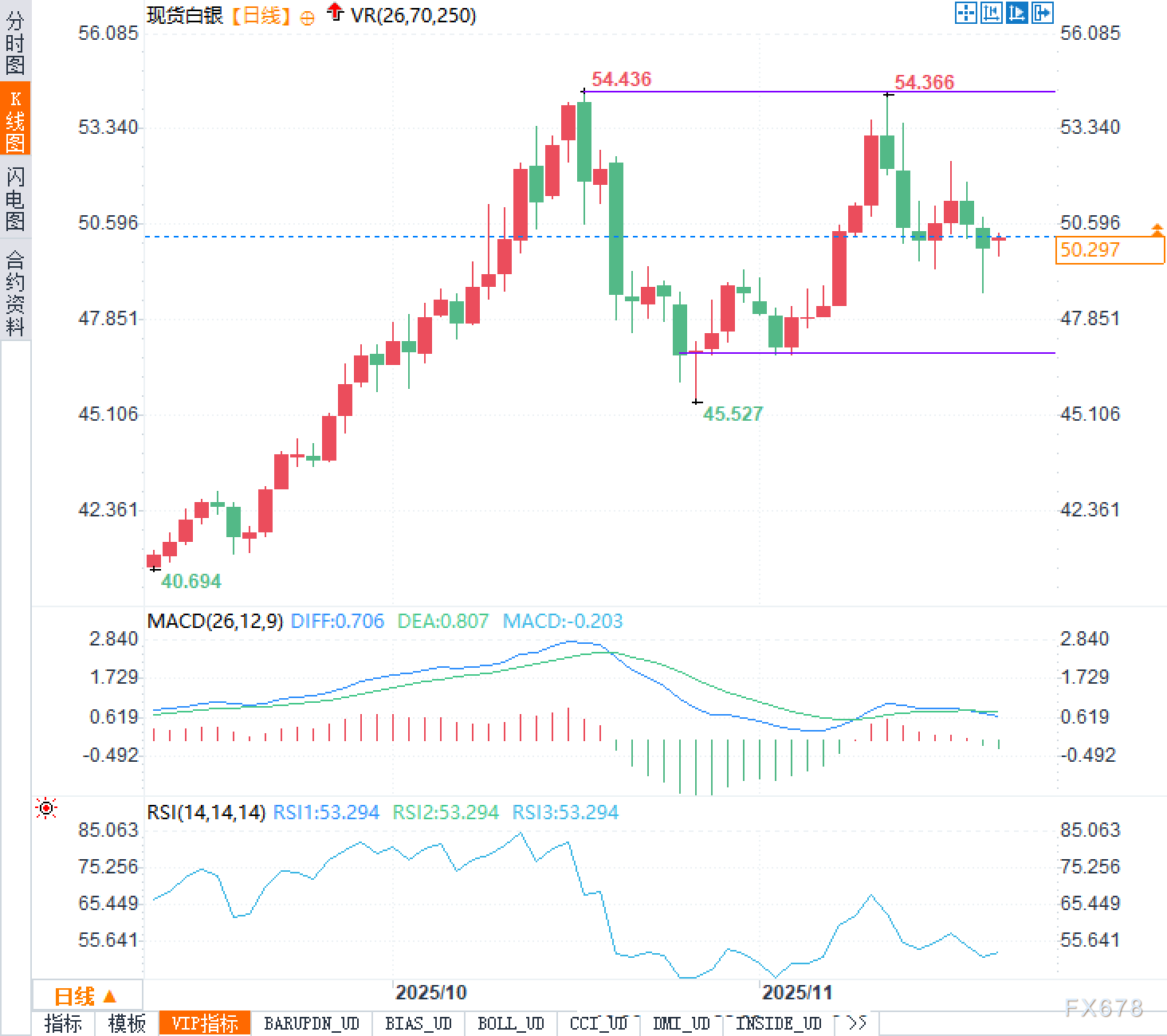 从日线图看,现货白银自40附近启动的上涨在54.4一带遇到明显抛压,随后回落并在45.5附近获得支撑,近期在47.8—53.3区间内反复震荡,目前价格50.30大致处于区间中部。