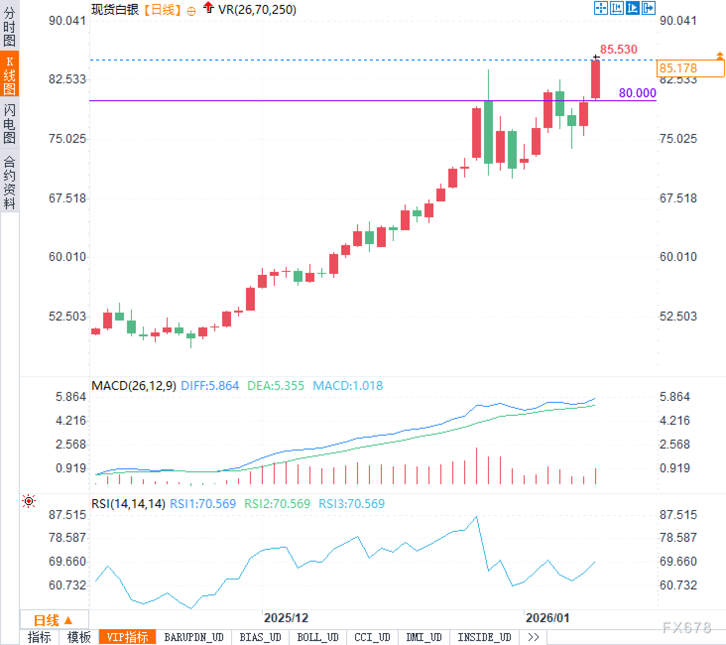 从技术图形看,现货白银日线级别仍处于清晰的上升通道中,近期成功突破前高后站稳,趋势结构完整。当前价格距离盘中高点85.53美元不远,显示出多头仍占主导。MACD指标持续运行于零轴上方,动能柱保持正值,说明上涨趋势尚未被破坏。