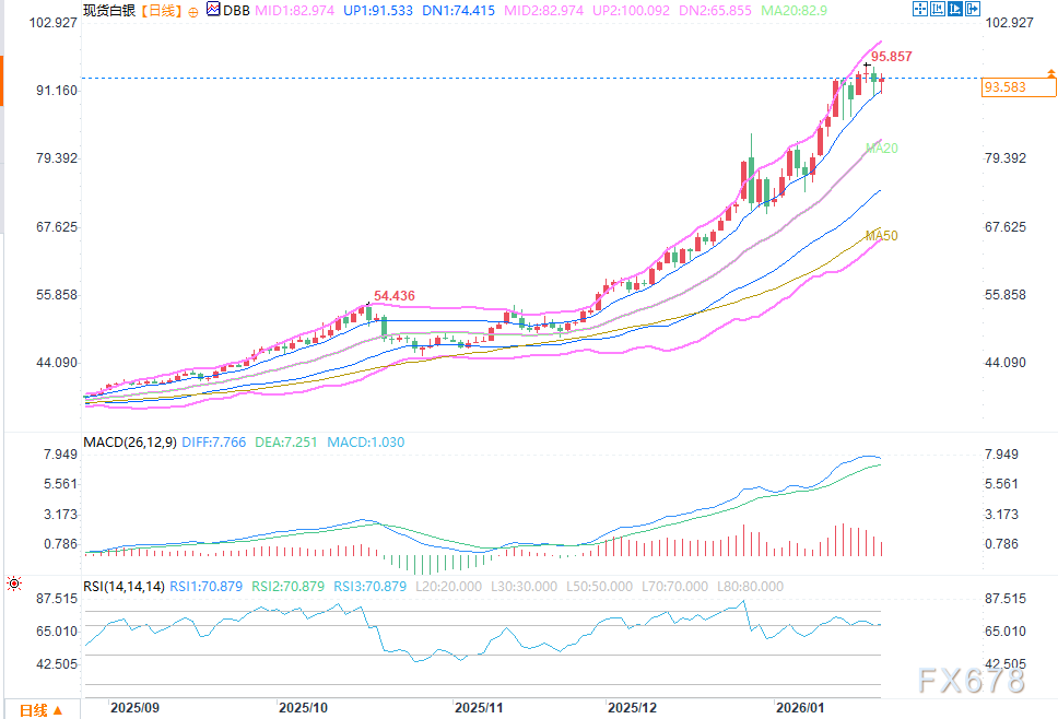白银市场向来兼具商品属性、金融属性与避险属性,而在当前趋势性行情中,技术性特征表现得尤为突出。正如前期市场规律所示,白银价格每上涨5美元,就会遭遇一轮技术性修正,无论是80美元、85美元、90美元,还是此次的95美元,均成为市场多空博弈的关键节点。这种规律性波动,一方面源于投资者对整数关口的心理预期,另一方面也与技术指标的超买信号密切相关。
