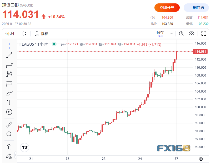 周四(1月29日)亚市盘中,现货白银价格一度上涨2.3%,创下119.40美元/盎司的历史新高,连续第六个交易日走高。 今年迄今,白银价格已经暴涨接近65%,这主要得益于投资者对避险商品的广泛兴趣。 花旗现在预计接下来的几周银价将有显著的上涨空间,反映出该行认为这是一次异常强劲的反弹。(银价年初至今走势图 来源:TradingView)