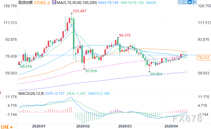 北京时间4月17日10:39 现货白银 报 78.49 美元/盎司
