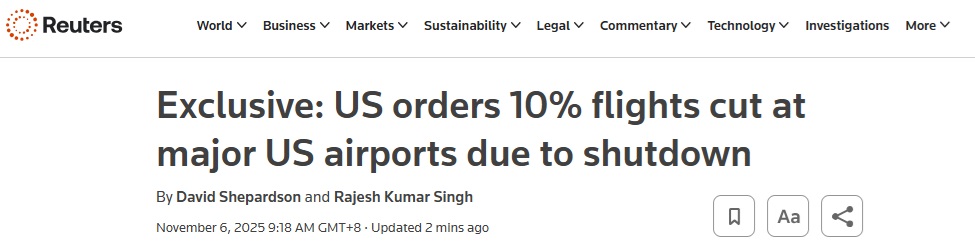 FX168财经报社(亚太)讯 英国路透社周三(11月5日)发布独家报道称,美国交通部长肖恩·达菲(Sean Duffy)周三表示,他将下令削减美国40个主要机场10%的航班,理由是出于空中交通管制安全方面的考虑,此时美国政府停摆已达到创纪录的第36天。