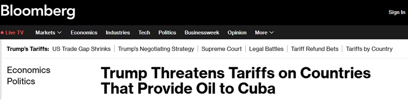 FX168财经报社(亚太)讯 当地时间周四(1月29日),美国总统特朗普(Donald Trump)签署行政令,宣布国家紧急状态,威胁对向古巴提供石油的国家输美商品加征从价关税。