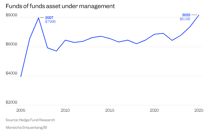 2008年金融危机与伯尼·麦道夫(Bernie Madoff)庞氏骗局的“双重打击”曾令“对冲基金中的基金”(Fund of Hedge Funds,简称FoHF)行业遭受重创,以至于该行业直到最近才重新超过2007年的资产规模水平。 根据Hedge Fund Research(HFR)的数据,截至2025年底,基金中的基金管理资产规模已达到8180亿美元。这是这家长期行业追踪机构记录以来的最高水平,也是该行业首次超过2007年底创下的7990亿美元历史高位。