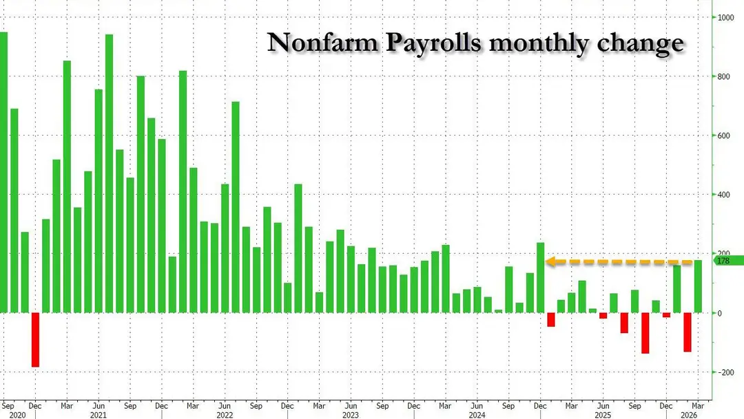 此前,《华尔街日报》调查的经济学家普遍预计,美国3月新增就业人数为5.9万人,失业率为4.4%。因此,从表面看,本次非农数据无疑强于预期。 不过,NerdWallet高级经济学家Elizabeth Renter表示,虽然本次就业增长“令人振奋”,但这并不意味着劳动力市场已经重回强劲扩张轨道。她指出,如果冲突持续,相关影响很可能会在5月或6月开始反映到就业市场,因此本次与下次非农报告大概率仍将呈现一种“平平无奇”的状态——既谈不上危险,也称不上强劲。 Oxford Economics首席美国经济学家Nancy Vanden Houten也表示,尽管3月非农就业人数超出预期,但这并未改变其判断,即伊朗战争已使美国劳动力市场面临的下行风险上升。她认为,基准情景仍是美联储将暂时忽略由油价上涨带来的“一次性通胀冲击”,并在年内降息两次,以防止劳动力市场未来进一步走弱。 Jefferies首席美国经济学家Thomas Simons指出,尽管本次非农数据表面表现亮眼,但并不足以实质性改变美联储的政策前景。因为这组数据本质上仍是“滞后数据”,很可能尚未反映近期能源价格上涨,以及伊朗战争带来的其他风险。因此,至少目前,并没有迹象表明美联储需要很快采取行动。 EY-Parthenon高级经济学家Lydia Boussour表示,尽管美国3月就业数据强劲反弹,但劳动力市场仍然脆弱。她认为,在政策环境充满不确定性的背景下,企业变得更加谨慎,招聘意愿正在降温,企业越来越倾向于保护利润率,并通过提升生产率而非扩大用工来应对。“展望未来,我们预计2026年的劳动力市场将基本处于冻结状态,其特征包括选择性招聘、工资增长受限以及在劳动力供给仍处于历史性紧张情况下进行战略性人员调整。”Boussour预计,就业增长将略低于盈亏平衡水平,失业率将逐步升至约4.7%。“鉴于中东冲突仍在持续,下行风险占主导,经济衰退概率为40%,”她补充称。 不过,也有更偏鹰派的声音。Apollo首席经济学家Torsten Slok表示,美联储日前一份研究指出,维持失业率稳定所需的“盈亏平衡就业增量”仅约为1万人。这意味着,过去3个月平均每月新增6.8万个岗位,其实已经是相当强劲的表现,说明当前美国经济动能仍然不弱。他同时警告称,风险在于通胀可能会在更长时间内维持高位。按当前市场定价来看,首次降息甚至被推迟到2027年10月,这表明市场已基本不再预期美联储会在短期内降息。