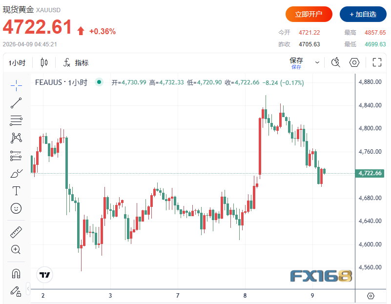 现货黄金日内一度转跌,此前一度涨超3%,刷新日低至4699.63美元/盎司。