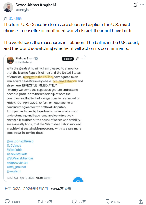 与此同时,伊朗外长赛义德阿巴斯·阿拉格齐在X上发文称:“伊朗与美国停火协议的条款是清晰且明确的:美国必须作出选择——是维持停火,还是继续借以色列之手延续战争。两者不可兼得。全世界都看到了黎巴嫩发生的屠杀。球现在在美国一边,全世界都在看,美国是否会兑现自己的承诺。”