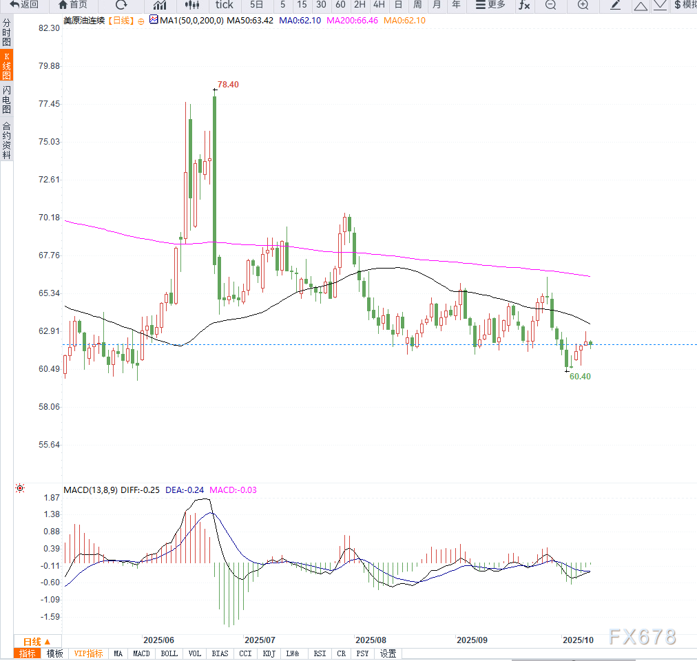 从技术面来看,WTI原油日线图显示价格自9月中旬高点回落后,持续运行于下行通道之中,短期均线(MA10与MA20)形成明显死叉,显示市场短线动能仍偏空。