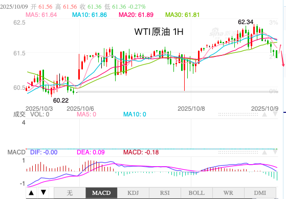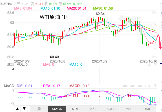 从技术图形来看,WTI日线显示价格自9月中旬高点67.40美元/桶以来持续走低,目前运行在61美元支撑区间附近。K线形态连续收出小阴线,反映出市场在低位震荡整理,买盘意愿不足。