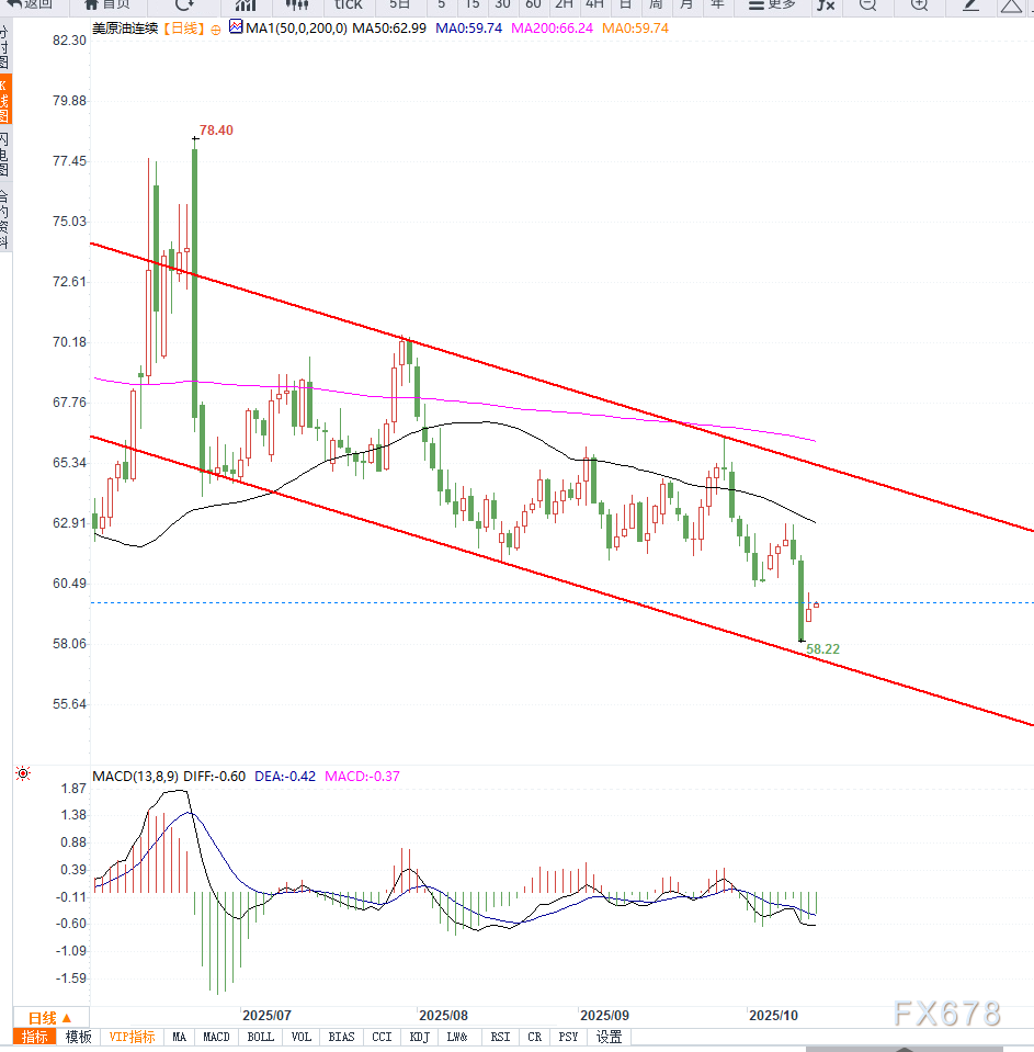 从日线结构来看,WTI原油在59美元形成阶段性支撑,短线价格维持在布林带下轨之上运行,显示空头动能开始减弱。20日均线位于61.20美元附近,为短期反弹的主要阻力。