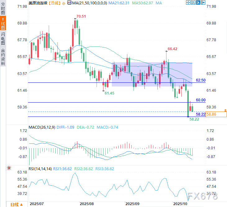 整体技术结构继续有利于空头,市场呈现高低点持续下移的看跌格局,动量指标也确认了看跌趋势的延续性。除非油价强势收复62.50美元中线区域并获得后续买盘支撑,否则阻力最小的路径仍是下行。