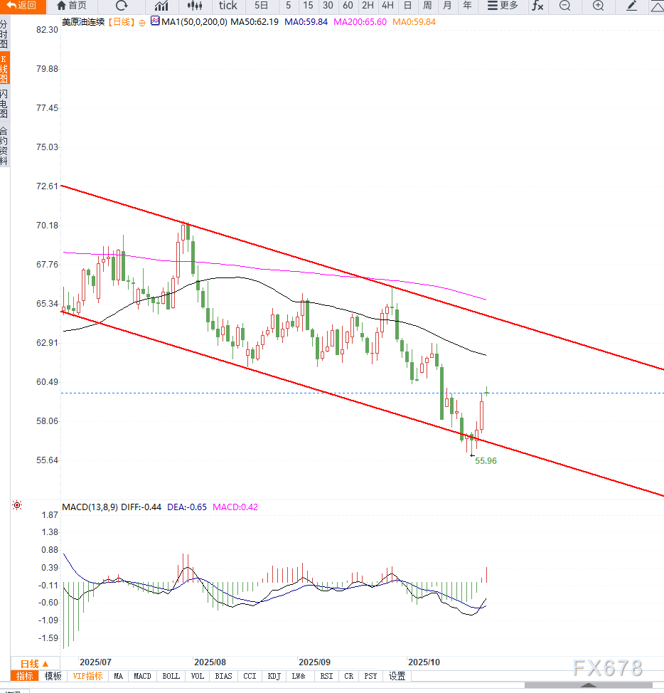 目前油价正向 60 美元关口发起反弹,若后续放量上破并企稳该水平,则多头有望进一步向 62–63 美元区域延伸;但若反弹乏力,则价格可能回测 57 美元一线的短支撑,进一步回踩风险仍需关注。