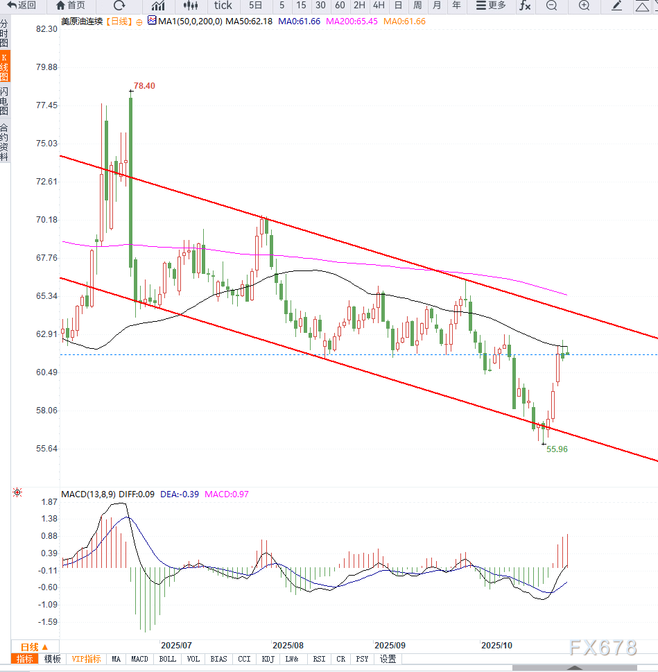 从日线结构观察,WTI在61.5美元附近获得企稳信号,MACD出现收敛迹象,均线结构转向修复阶段。