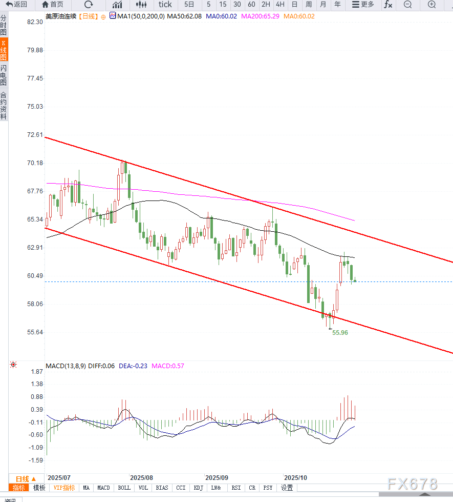 从技术面来看,WTI原油日线图显示价格已连续三日收阴,并跌破60.50美元关键支撑位,短期趋势转为弱势。MACD指标持续向下发散,显示空头动能增强;RSI维持在40附近,尚未进入超卖区,暗示油价仍有进一步下行空间。