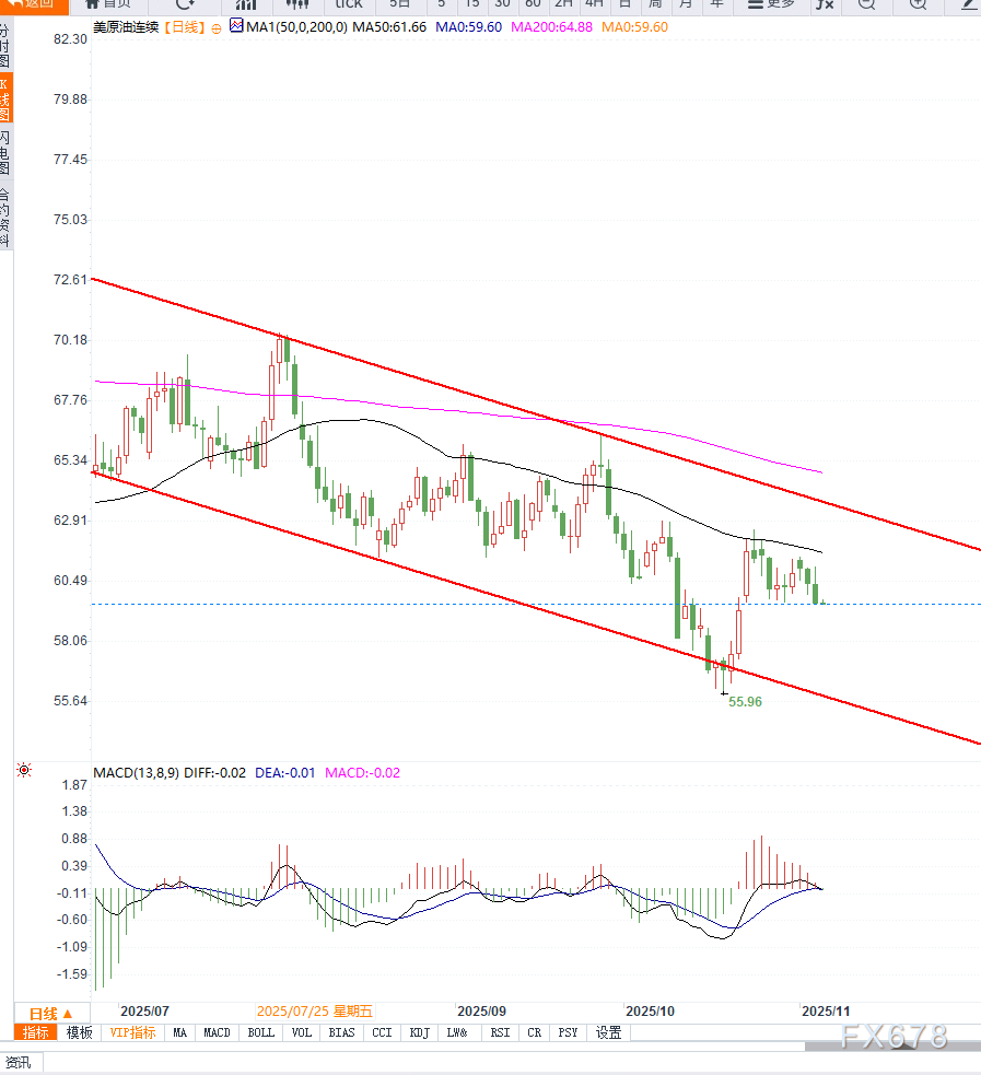 从日线图形分析来看,WTI原油连跌多日,价格已跌至59.50美元关键支撑带附近。从结构上看,K线跌破短期均线组合(MA10 与 MA20),且 MACD 指标死叉继续扩大动能,显示空头占据主导。