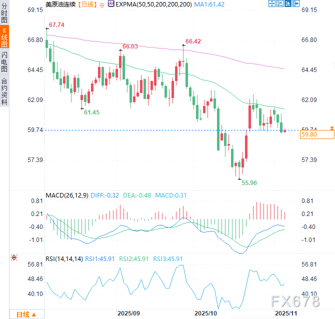 汇通财经APP讯——周四(11月6日)美原油连续在经历三日连跌后小幅回升,目前上涨0.4%至每桶59.83美元附近,此前油价一度跌至近两周低点59.52美元/桶。然而由于库存大幅增加加剧供应过剩担忧,油价可能进一步下挫。