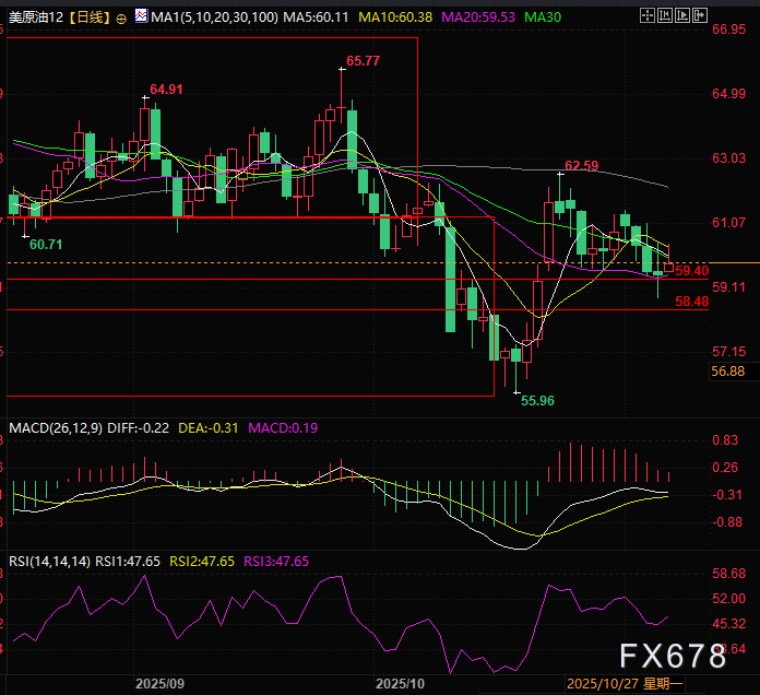 汇通财经APP讯——周五(11月7日)亚欧时段,美原油走出了冲高回落走势,近期油价宽幅震荡,目前交投于59.87美元附近,虽然在60下方但油价依然在维持在相对强势区间内整理。