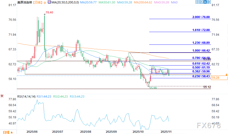 下方支撑位密集分布,初步支撑位于60.05美元,更关键支撑区间为59.27-58.50美元的回调区域,其中包含58.83美元的摆动低点。目前市场处于消息面驱动的短期交易与供应过剩担忧的拉锯之中。