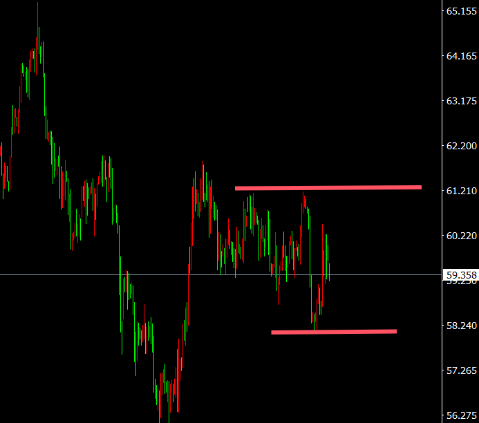 原油上周整体处于区间运行,当周最高61.2,最低58.1,周线收十字星于59.8,周线看油价还将呈大区间运行,日线,区间震荡,上方关注61.5的突破情况,综述本周操作思路先看58-62区间,下破下看57,日内,四小时线,呈区间震荡,小时线,震荡,今早小跳空,低开低走,下方关注59和58,日内思路以震荡为主,上方关注60
