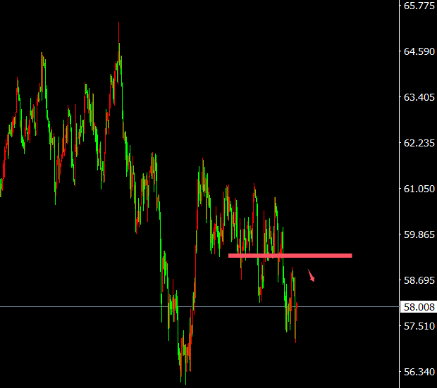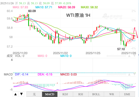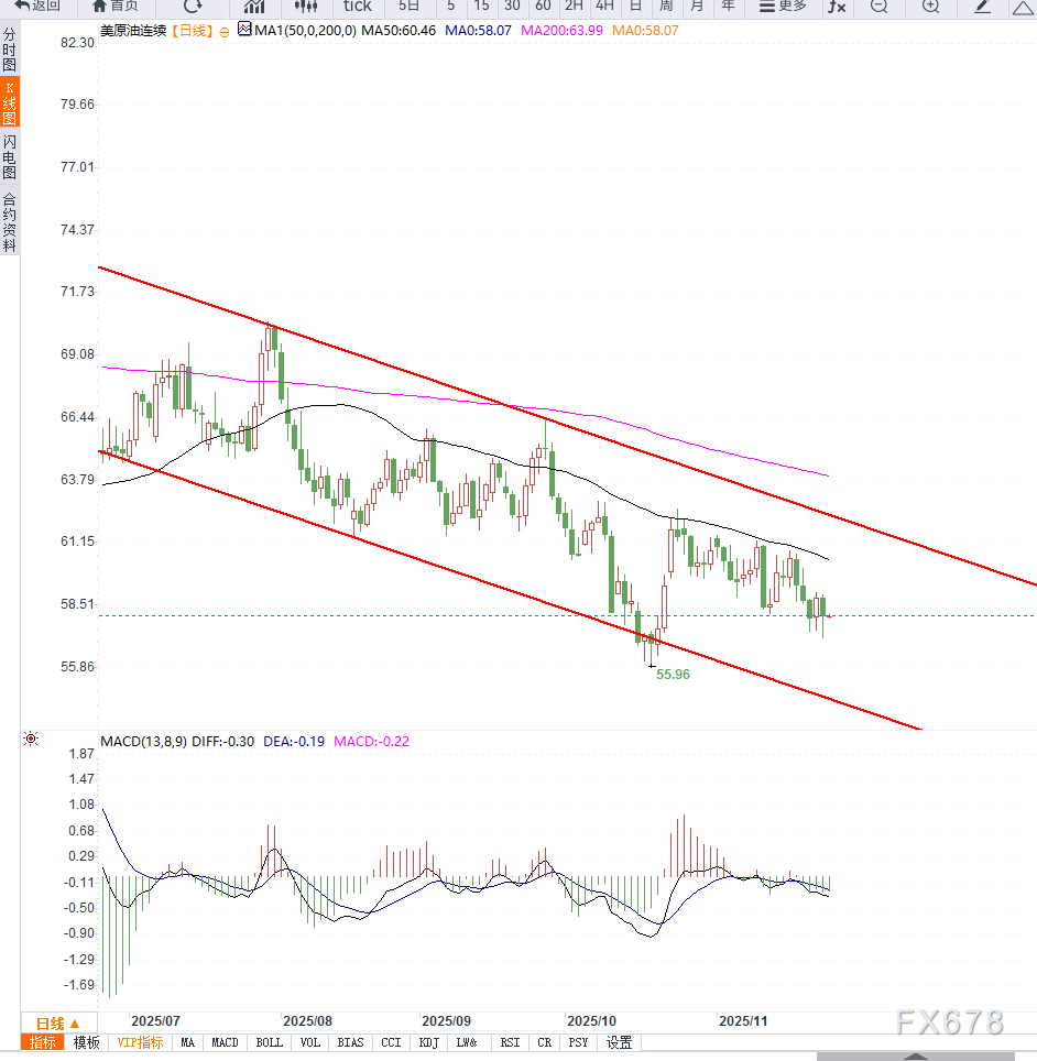 当前WTI在58美元附近震荡,接近前期低点支撑区域,若有效跌破该位置,可能进一步下探至55美元一带;而上方阻力则关注60美元整数关口及5日均线压制。
