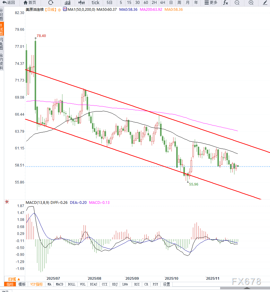 而美元走软与降息预期仅提供边际支撑。在缺乏突发地缘冲突或OPEC+超预期减产的情况下,油价难以摆脱57–60美元区间的震荡格局。应警惕感恩节假期前后流动性不足可能放大波动。若58美元支撑失守,下一关键测试位或将下探55美元区域。