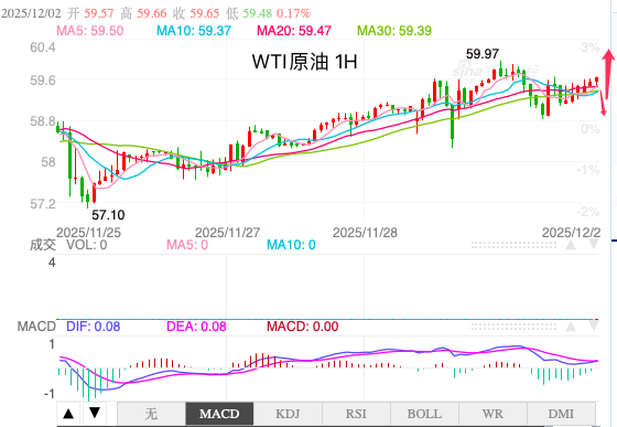 MACD指标出现低位金叉并向零轴上方靠拢,动能柱逐步放大,代表趋势偏向进一步强化。下方支撑关注58.50美元与57.80美元区域,一旦守稳,多头有机会向60.50美元及61.30美元一线试探