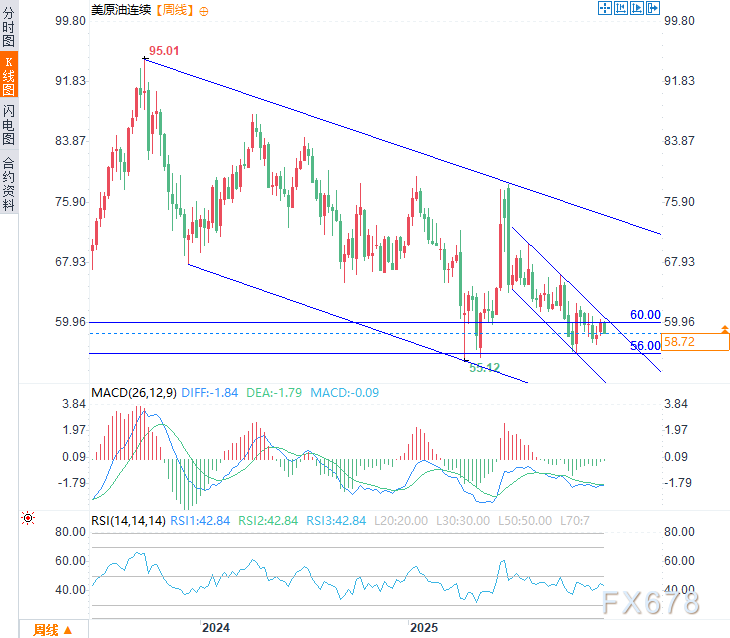 从周线级别的技术视角来看,原油价格自2023年10月起便在一个向下倾斜的平行通道内运行,而该通道又嵌套在一个始于2025年6月的下降通道之中。