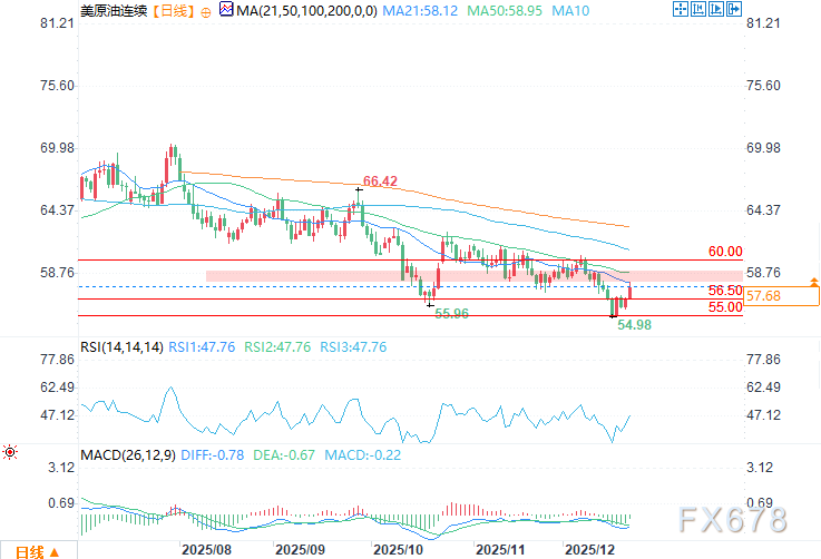日线图显示,WTI原油目前正测试58.00-59.00美元区间。该区间曾为支撑位,如今已转化为阻力位,且与21日和50日简单移动平均线(SMA)于该区间相重合。这一多重压力位持续压制油价的短期上行空间,若价格成功突破,下一关键阻力位将是60.00美元心理关口。