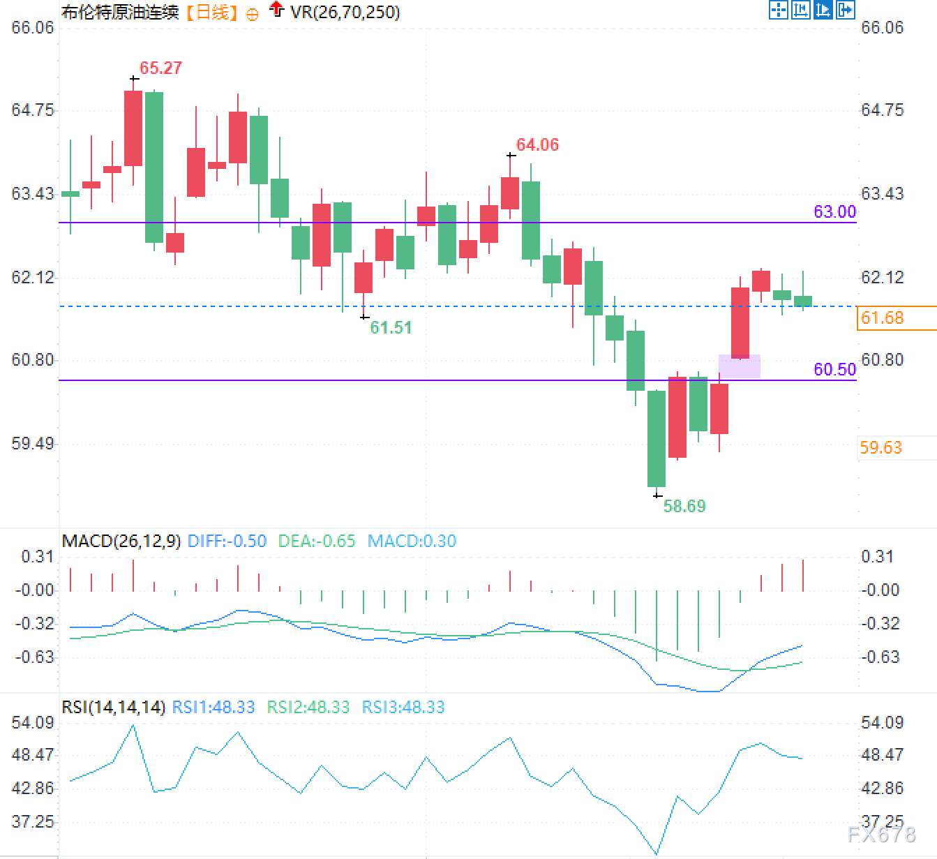从日线蜡烛图看,布伦特原油此前自65.27美元高位下行,途中多次反抽至64.06美元附近受挫,显示上方抛压区仍然清晰;下行过程中最低触及58.69美元后出现快速拉回,形成“急跌—急弹”的V形特征,但当前价格回到61.50美元附近后明显转入盘整市场,说明多头并未获得连续推进的动能。结构上,63.00美元是当前最关键的静态阻力线:它既是前期密集成交区的上沿,也与回撤后的反压位置重合。下方60.50美元构成短线核心支撑位,一旦跌破,价格大概率会向59.50美元的次级支撑位靠拢;再往下则是58.69美元的阶段低点,属于空头市场情绪的“最后防线”。