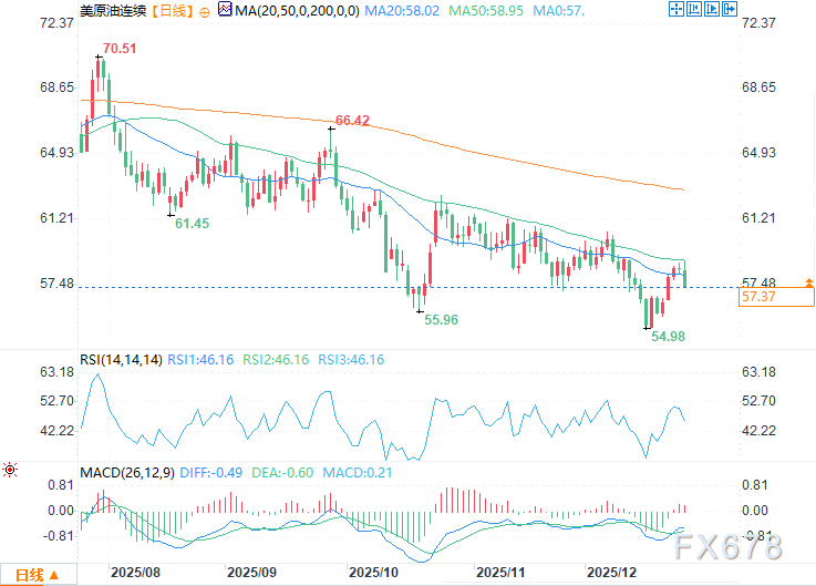 尽管原油市场存在其他技术支撑位与指标参考,但核心趋势仍由50日均线与200日均线主导。自10月25日油价触及62.40美元的阶段高点后,WTI原油价格跌破50日均线并持续运行于均线下方;此后,50日均线先后在61.31美元、61.09美元、60.71美元及60.36美元的价位,多次压制油价反弹,每次反弹遇阻后,油价均创下阶段新低。而高点持续下移、低点不断走低,正是空头趋势的核心技术定义。