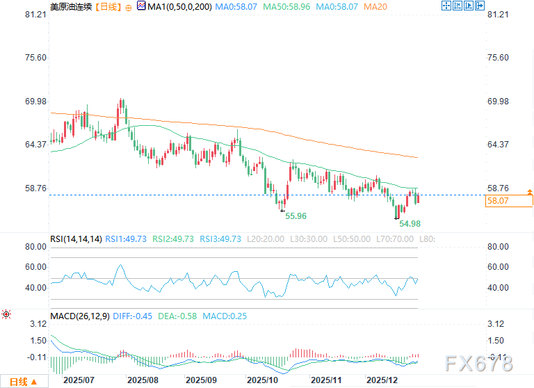 从技术层面看,轻质原油期货的中长期下跌趋势尚未扭转,但短期上涨动能已小幅抬头。其短期价格区间落在54.84美元至58.88美元之间,该区间的50%回撤位56.86美元,是近期的核心支撑点;而目前油价已收复另一关键50%回撤位57.60美元,这一进展进一步为反弹积聚了动能。