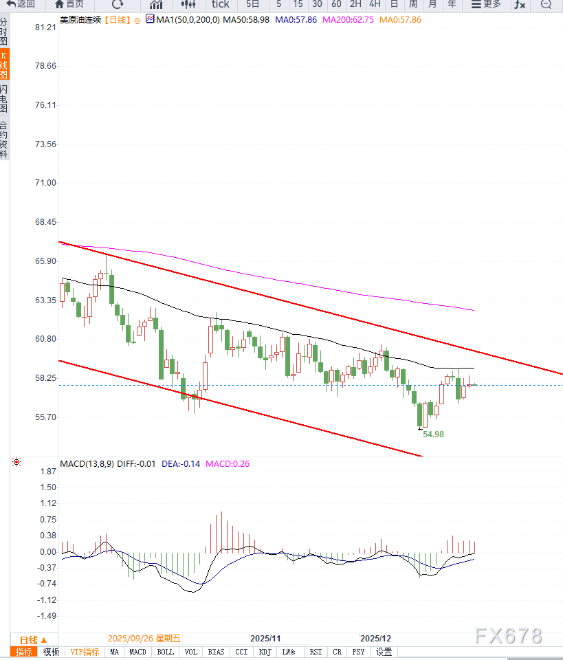 从技术面来看,美原油(WTI)日线图形仍处于偏弱震荡格局。价格在前期反弹后受制于59美元整数关口,多次上行未能有效突破,显示上方抛压较重。