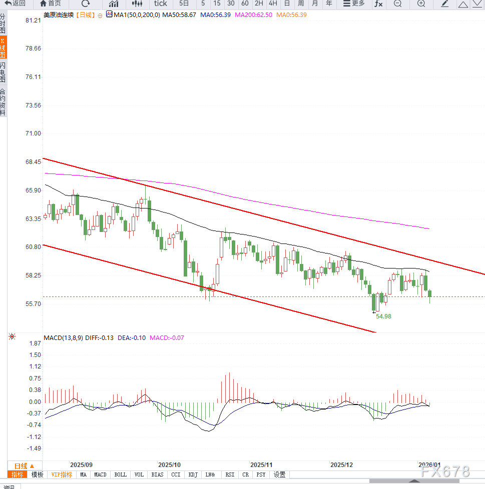 从技术面来看,美原油日线级别仍处于震荡下行通道中运行。价格在此前反弹受阻于60美元整数关口后重新回落,显示该区域已转化为明显的阶段性压力位。