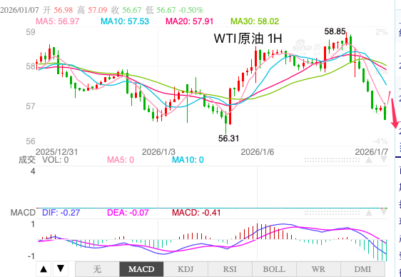 汇通财经APP讯——受委内瑞拉原油可能增加出口的消息影响,国际油价短线承压回落。WTI原油主连合约盘中跌幅一度超过1.6%,现交投于56.40美元/桶附近,布伦特与WTI期货价格同步走低,显示市场对新增供应的反应较为直接。