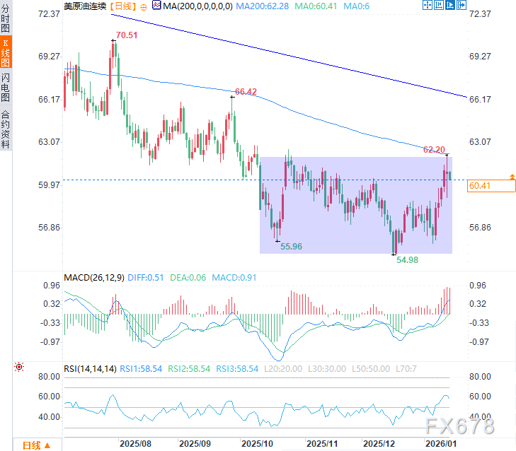 从技术面看,油价此前已连续五个交易日上涨,推动价格从三个月波动区间(55-62美元)底部升至区间顶部。从图表分析角度看,价位已触及关键分水岭:若油价突破62美元附近阻力(含200日均线62.28),则可能打开上行空间,向着66美元附近的半年多高点迈进,该位置接近自2023年下半年高点形成的长期下降趋势线阻力位。