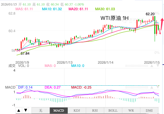 汇通财经APP讯——周四(1月15日)亚市早盘时段,美原油价格震荡下行,日内跌幅约2.5%,现交投于每桶60.35美元附近,因基本面供应压力持续。前一交易日油价上演过山车行情,日内振幅5.11%,因市场担忧伊朗原油供应遭破坏而上涨,而后因伊朗镇压行为减弱而回落,一度触及62.20美元的近三个月高点。