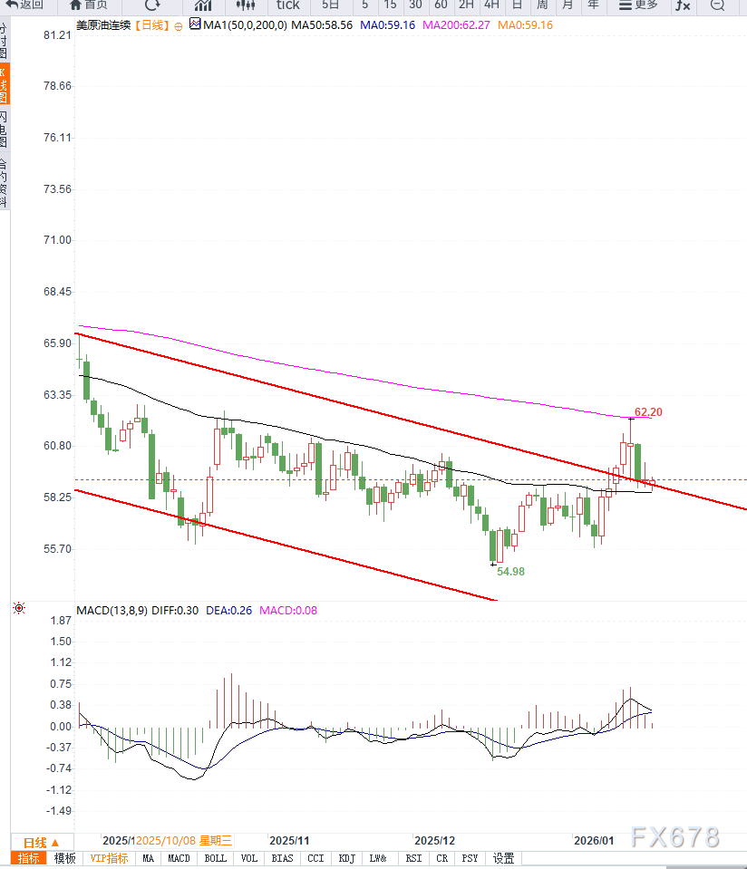 结合形态判断,58.20美元附近是短期重要支撑,一旦有效跌破,价格或进一步测试57.40美元甚至56.50美元的前期低点;而上方60.00—60.50美元区间已转化为关键阻力,只有重新站稳该区域并伴随成交量放大,短线格局才可能重新转强。