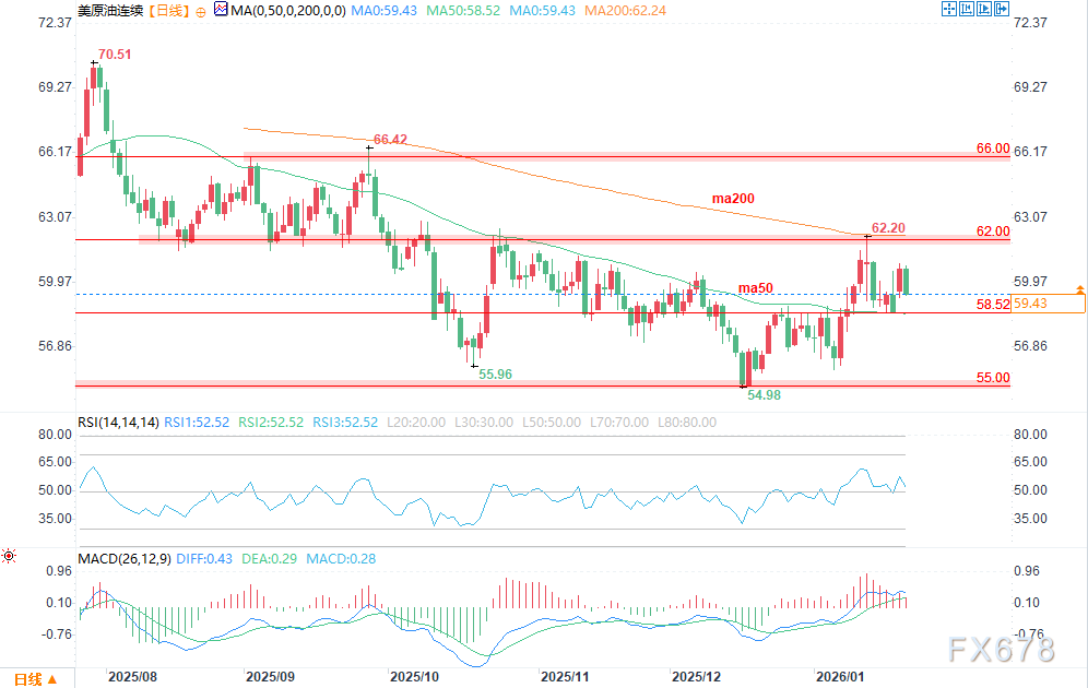 技术面上,当前美原油价格运行于50日均线(MA50,58.52美元)上方,但受阻于200日均线(MA200,62.24美元)。50日均线走势平稳,200日均线仍呈下行态势,表明中期趋势尚未明确反转,市场处于低位震荡整理阶段,价格近期围绕59.43美元展开争夺。