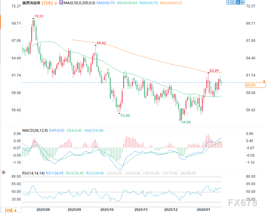 技术面分析显示,WTI原油短期仍处于震荡整理区间。目前价格位于60.82美元附近,略高于50日均线58.64美元,但仍低于关键的200日均线62.22美元,意味着多头尚未突破长期关键阻力位。从近期走势来看,价格虽有反弹,但未能有效突破此前高点62.20美元,上方抛压明显。