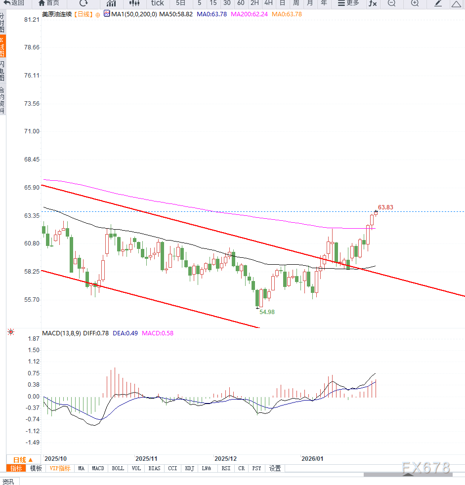 从日线图形来看,WTI原油整体维持在中期上升通道之中,价格连续突破此前震荡区间上沿,显示多头力量明显增强。日线级别上,油价已有效站上多条关键均线之上,短期与中期均线呈现多头排列,技术形态对多头较为有利。