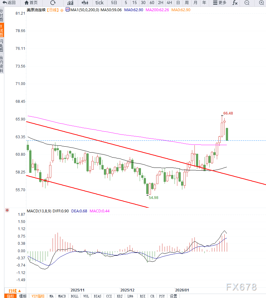 从关键位置看,上方65至67美元区间构成重要阻力带,若有效突破并站稳,油价有望进一步向70美元附近延伸;下方62美元一线则是短期重要支撑,若失守,意味着本轮反弹可能演变为区间震荡中的技术修复。