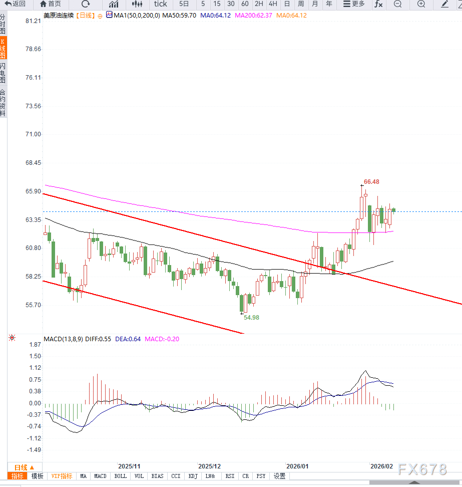 从技术走势来看,WTI原油在近期反弹后仍处于震荡修复阶段。日线图显示,油价自前期低点反弹,但整体运行区间依然受限,中期趋势尚未形成明确反转。