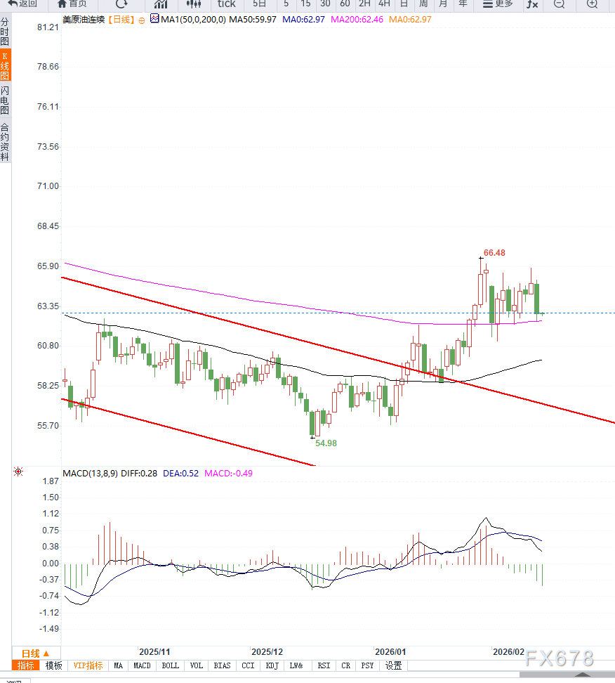 从日线结构观察,WTI原油期货近期在63美元下方运行,显示短线趋势开始转弱。此前的震荡上行结构已被打破,价格跌破前期上升通道下沿,市场节奏由趋势行情转向区间震荡。