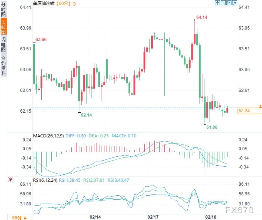 美伊谈判取得进展的迹象,削弱了大宗商品需求。周二美原油价格跌逾2%,一度触及两周低点61.87美元/桶,周三亚市时段,美原油价格于每桶62.25美元附近窄幅震荡。