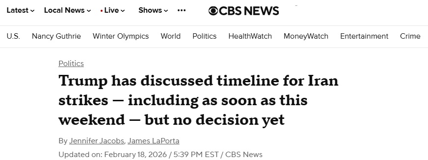 #中东局势#FX168财经报社(亚太)讯 美国哥伦比亚广播公司(CBS)当地时间周三(2月18日)报道称,据了解相关讨论的消息人士向CBS新闻透露,美国国家安全高官已告知美国总统特朗普(Donald Trump),军方已做好最早于周六对伊朗发动潜在打击的准备,但任何行动的时间表可能会延至本周末之后。