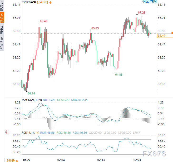 汇通财经APP讯——周四(2月26日)亚市时段,美原油价格小幅上涨,现交投于每桶65.50美元附近,日内涨幅约0.17%,市场静待今日晚些时候的美伊日内瓦谈判。美方在完成大规模军事部署后态度强硬,要求将导弹计划纳入谈判议题;伊朗则坚持议题仅限于核计划,并要求美国同步解除制裁。双方在导弹射程评估上存在明显分歧,本轮谈判结果将直接影响地缘风险溢价及油价走势,若外交突破有望缓解供应担忧,若谈判破裂则可能再度推升油价波动。