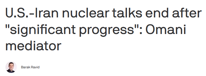 昨日,美伊在日内瓦举行第三轮间接谈判。阿曼外交大臣巴德尔表示谈判取得“重大进展”,并称双方将在各自政府磋商后尽快恢复会谈,技术层面讨论将于下周在维也纳举行。