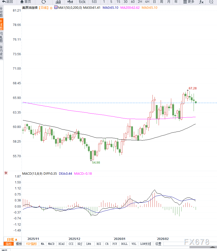 从技术结构看,WTI日线自60美元区域反弹后在65-67美元区间形成横向震荡平台,均线系统逐步走平显示趋势动能减弱,RSI指标位于50附近反映市场情绪中性;